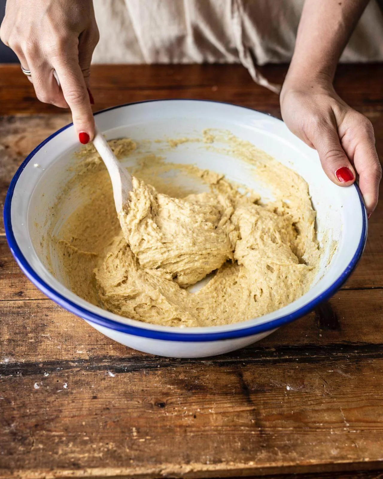 - Die trockenen Zutaten separat vermengen, zu der Eiermischung hinzugeben und alles zu einem glatten Rührteig verarbeiten. Wichtig ist, dass der Teig nicht überrührt wird.