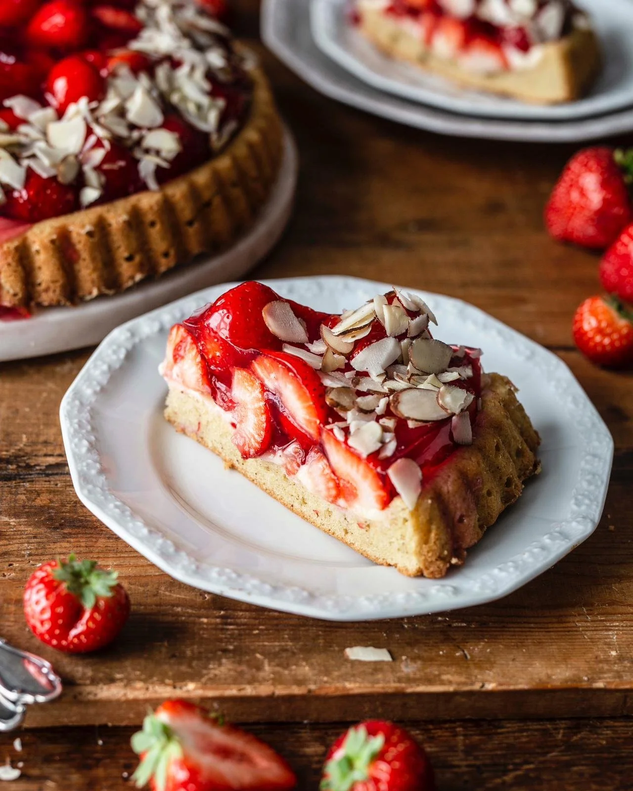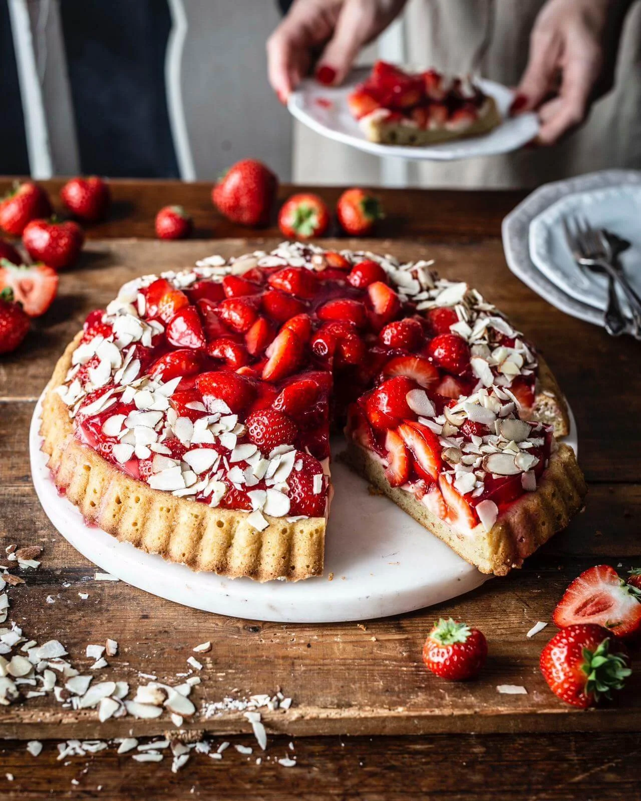 - Tortenguss nach Packungsanweisung mit 1 EL Zucker und Wasser zubereiten. Auf dem Kuchen verteilen und Kuchen für 30 Minuten in den Kühlschrank geben, bis der Tortenguss fest ist. Mit Mandelblättchen garnieren. Jetzt kannst du den Erdbeerkuchen genießen. Wir mögen ihn am liebsten etwas kälter aus dem Kühlschrank.