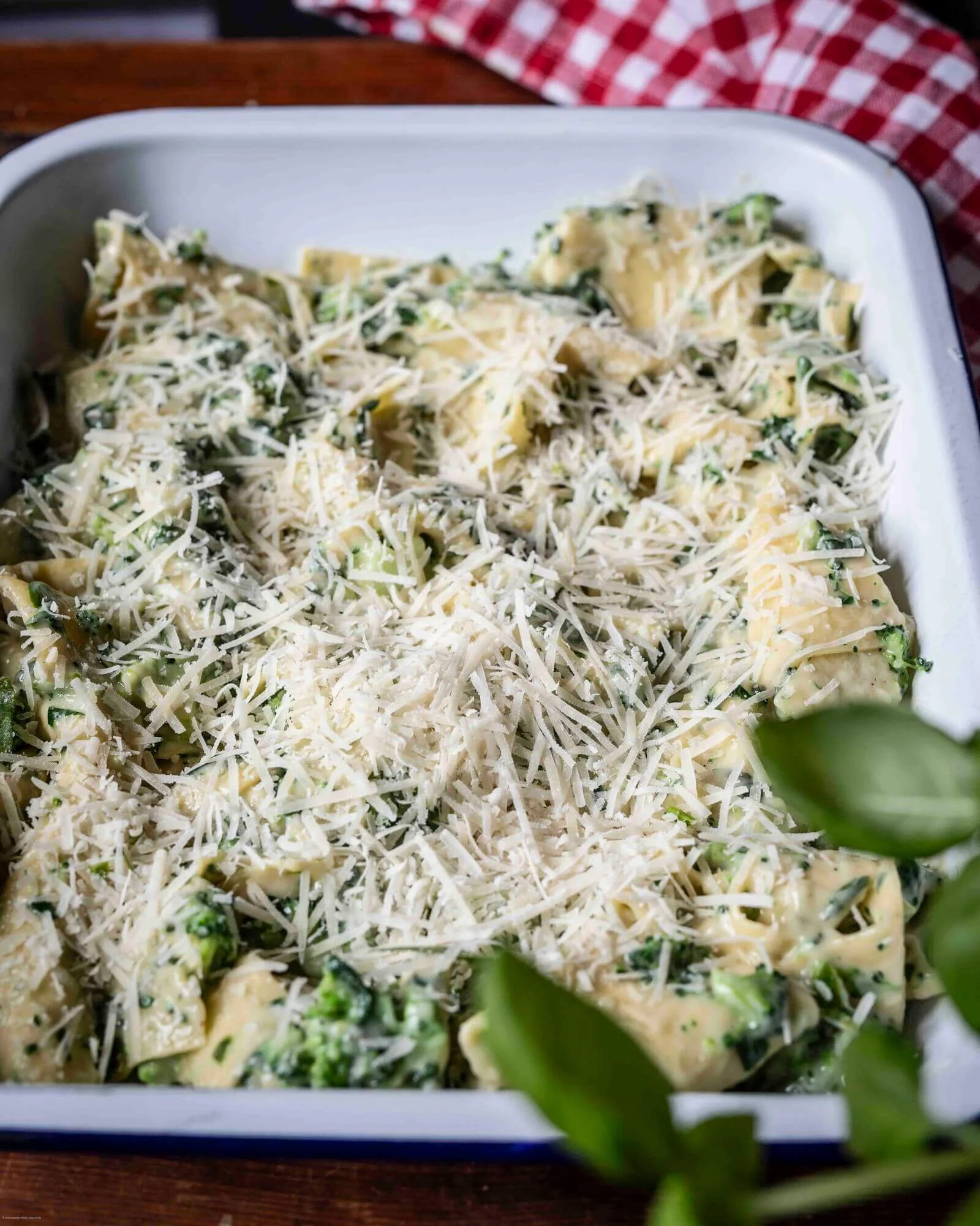 - Jetzt den Brokkoli, Spinat, Parmesan und anschließend die gekochten Lasagneblätter unterheben. Auf einem kleinen Backblech verteilen und nach Wunsch etwas weiteren Parmesan darüberstreuen.