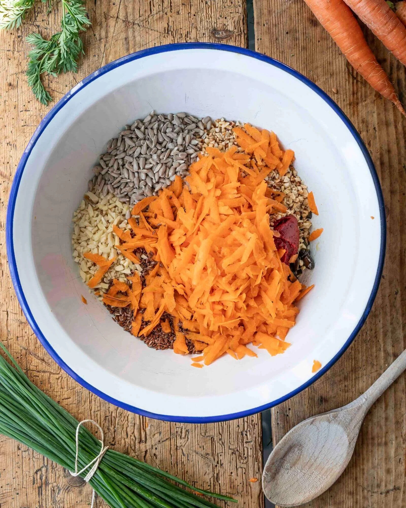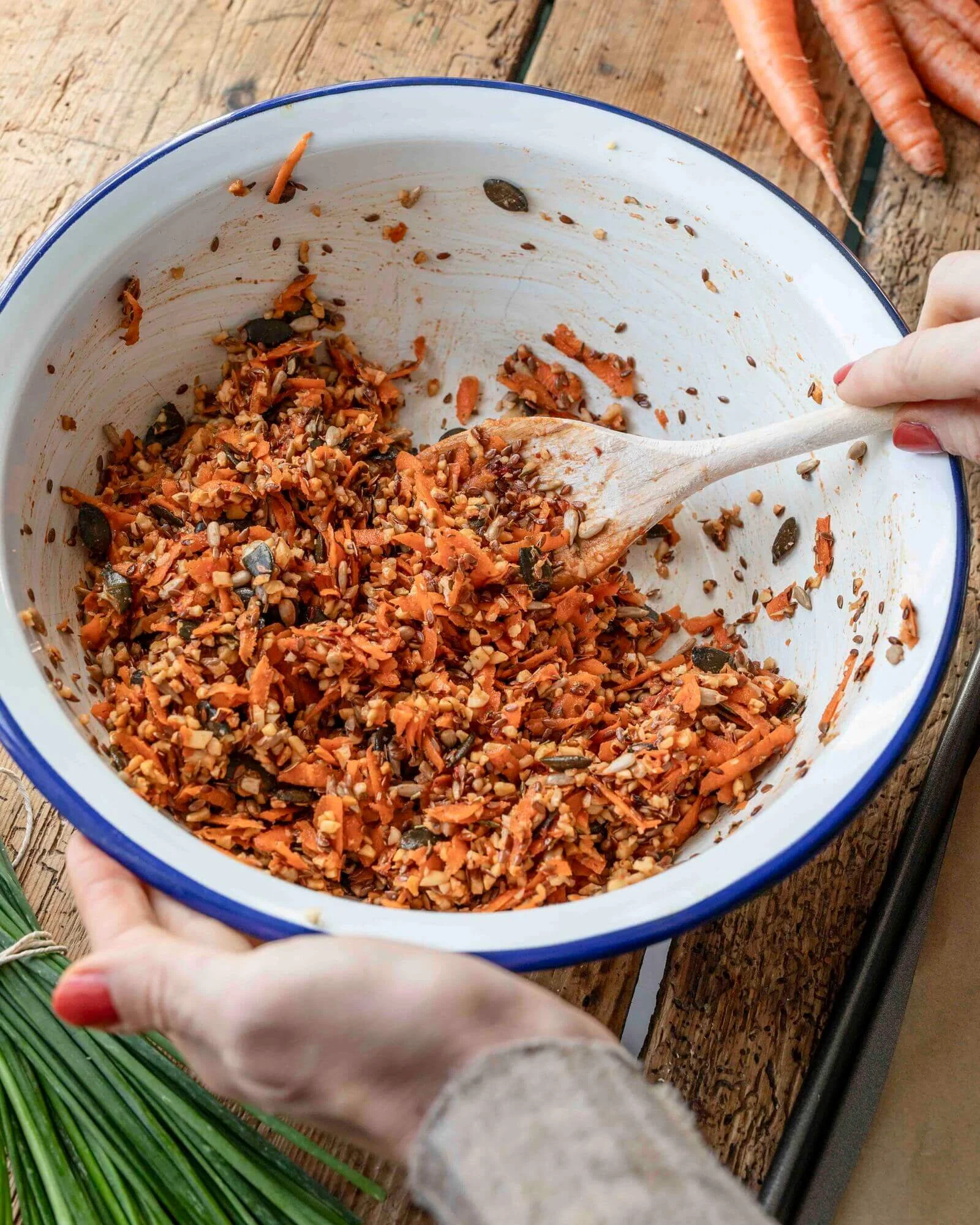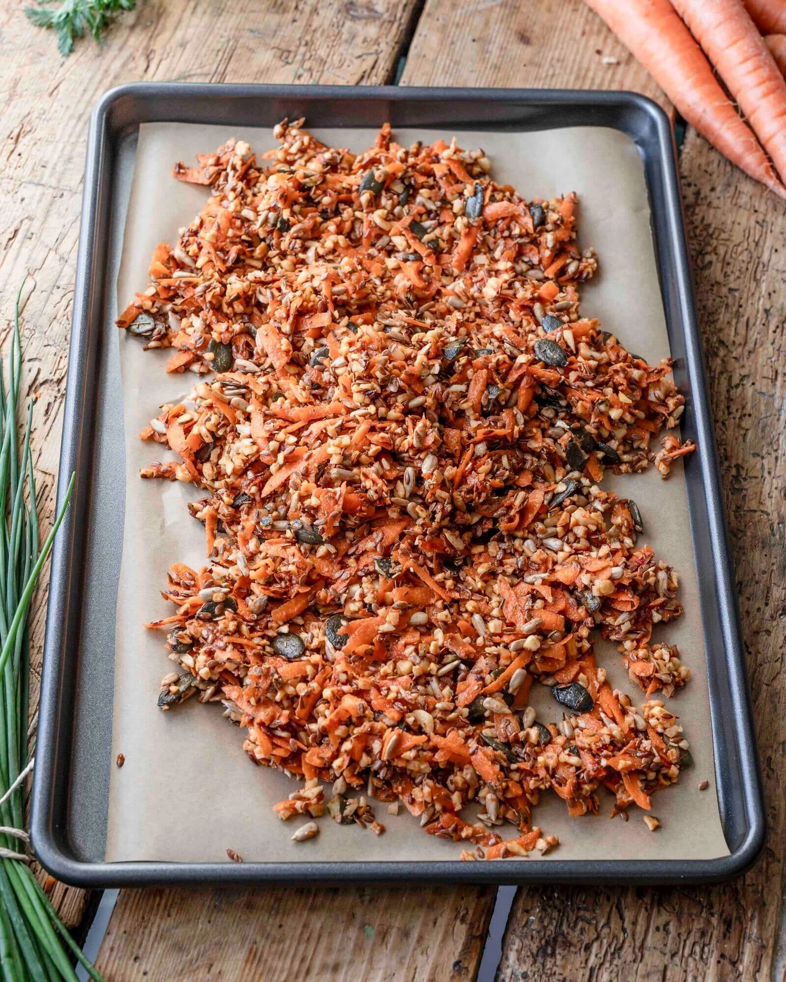 Wir haben bei einem unserer ersten Backversuche die Möhren grob geraspelt. So gelingen die Leinsamen Cracker auch. Sie werden jedoch ein klein wenig brüchiger. Daher empfehlen wir dir, dass du die Möhren fein raspelst. Das ist von Hand etwas anstrengender. Du kannst aber auch, wenn du eine hast, die Küchenmaschine verwenden. Der Rest der Zubereitung ist dann einfach.