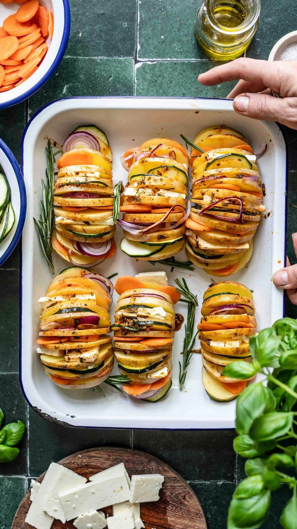 Alles, was du brauchst, sind ein paar frische Zutaten, die man meistens ohnehin zu Hause hat: Kartoffeln, Gemüse, etwas Käse und eine Handvoll Gewürze. Die Marinade sorgt dafür, dass deine Hasselback Kartoffeln außen knusprig und innen herrlich würzig werden.