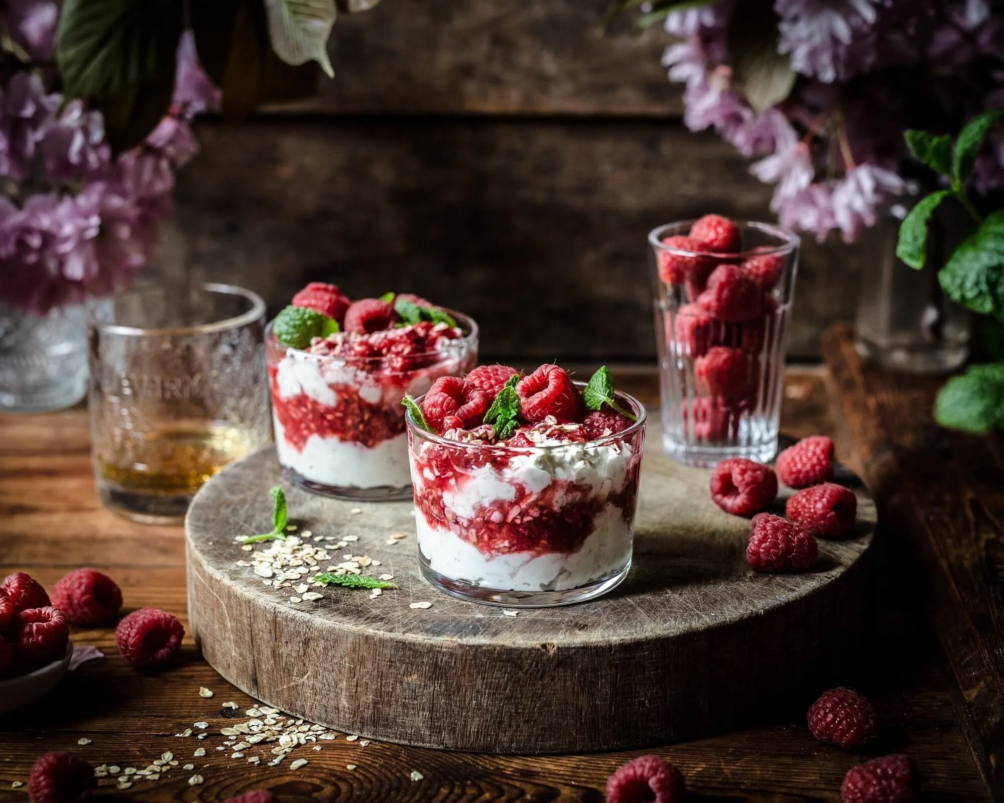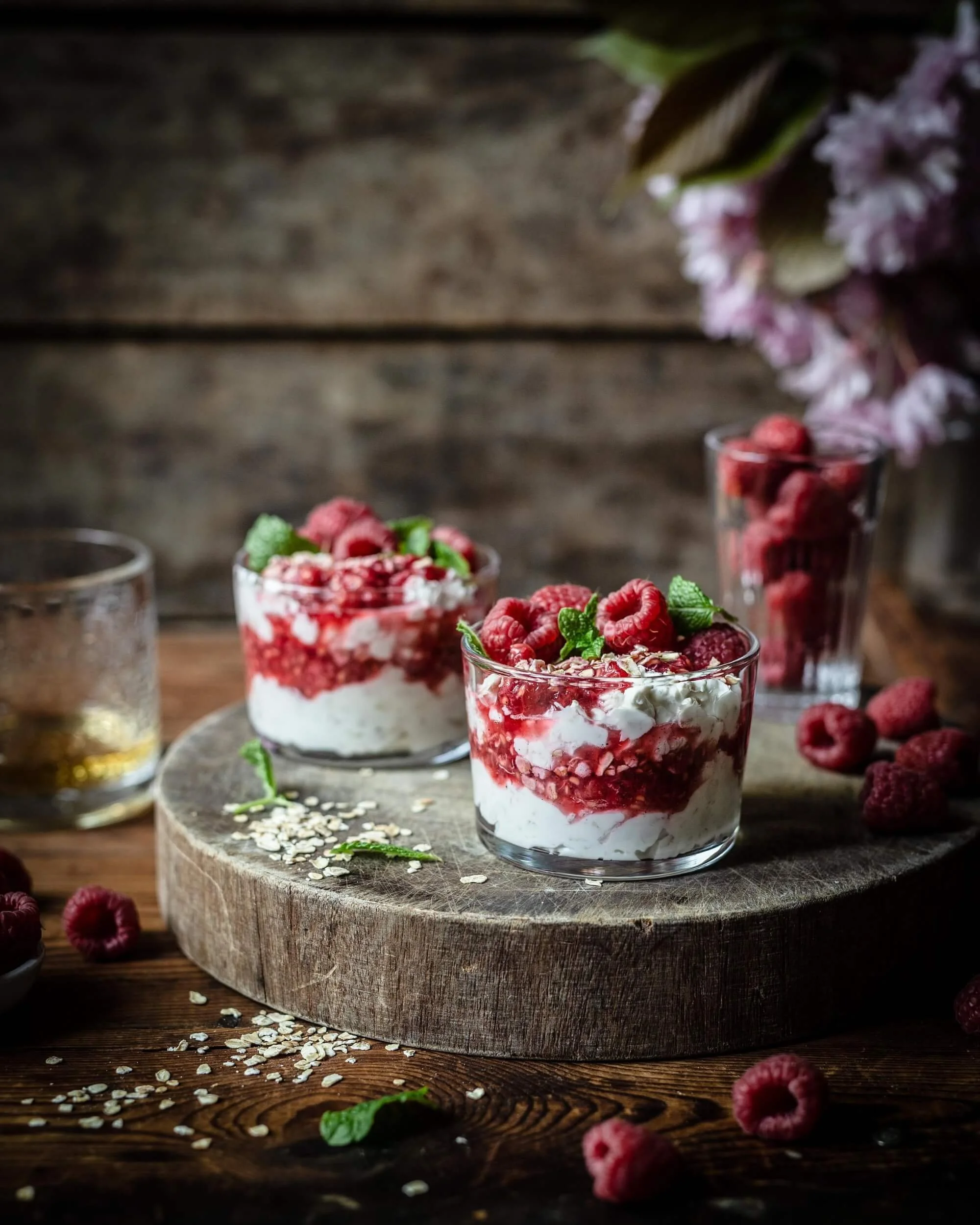 Dieses Schichtdessert im Glas besteht aus einer Sauce aus fruchtigen Himbeeren, Honig und Whisky sowie einem cremigen Layer aus Topfen und gerösteten Haferflocken. Wie es sich für ein Schichtdessert gehört, spielen alle Lagen perfekt zusammen und überzeugen mit dem ersten Löffel. Die süß-sauren Himbeeren harmonieren perfekt mit Honig, Vanille und Whisky. Zusammen sind sie wie gemacht für die cremigen Schichten aus Quark mit gerösteten Haferflocken. Unser Schichtdessert ist der perfekte Nachtisch nach einem Essen mit Freunden oder einem gemeinsamen Grillabend. Außerdem eignet er sich als kleines süßes Highlight für zwischendurch.