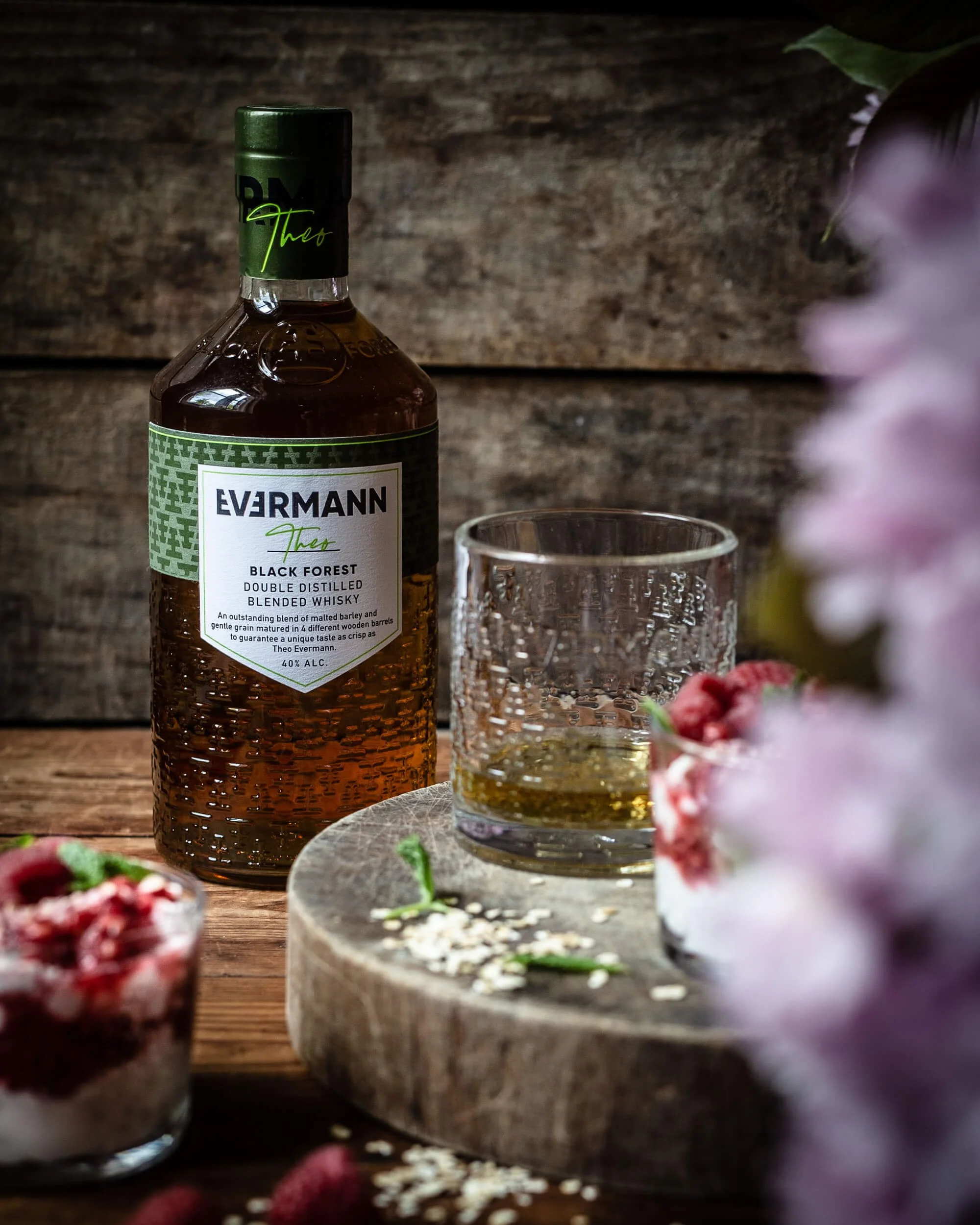 Beim Durchlesen der Zutaten hast du vielleicht bereits “typisch Schottisch” gedacht. Denn in der leuchtend roten Himbeersauce steckt ein wenig Whisky. Für unseren Geschmack ist er die Zutat, die dem Nachtisch sein besonderes i-Tüpfelchen aufsetzt. Whisky und Himbeeren passen hervorragend zusammen. Genauso wie der Honig, der unter die Himbeeren gerührt wird. Beide - Himbeeren und Honig - greifen Geschmacksnuancen des Theo EVERMANN auf. Hierbei handelt es sich um den Whisky, den wir verwendet haben. Er stammt aus dem Hause Bimmerle und ist eine beeindruckende Neuerscheinung, die Bimmerle vor kurzem gelauncht hat. Theo EVERMANN kommt fein-würzig daher, mit leichten Karamellnoten und malzig-mittlerem Körper. Er schmeckt fruchtig nach Trockenfrüchten, Orangen- und Zitronenschalen - perfekt für die Kombination mit Himbeeren.