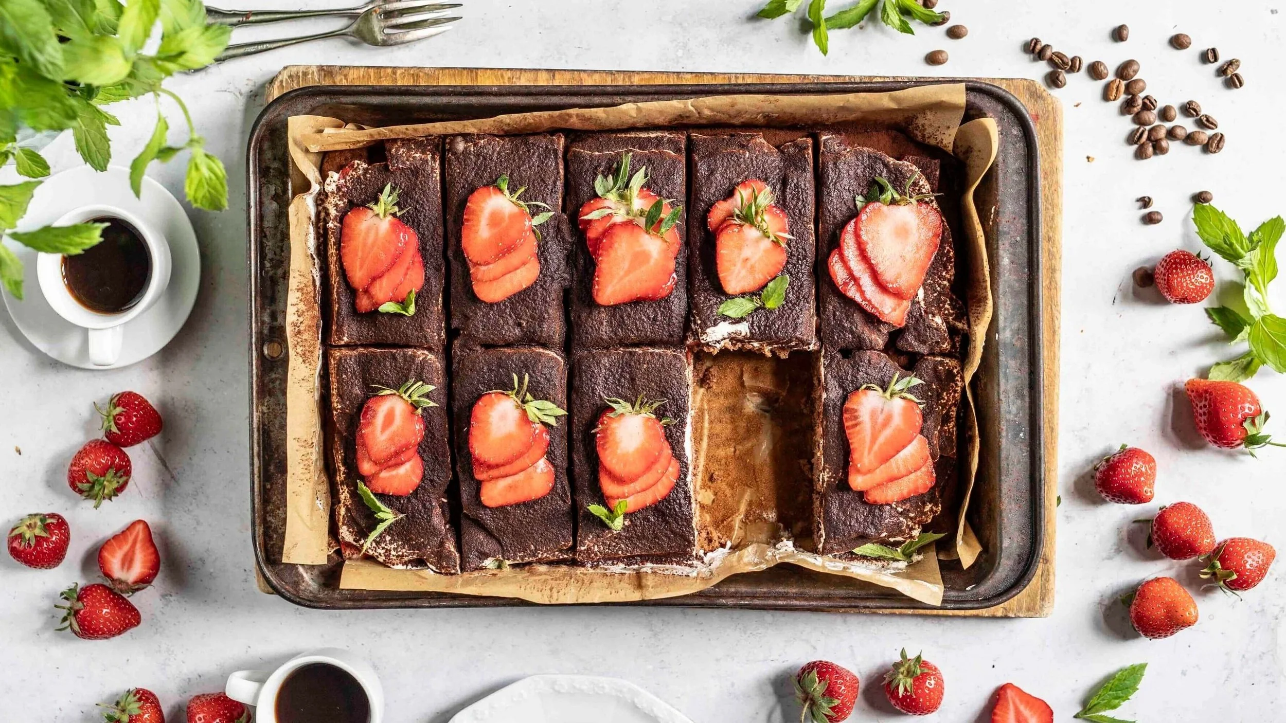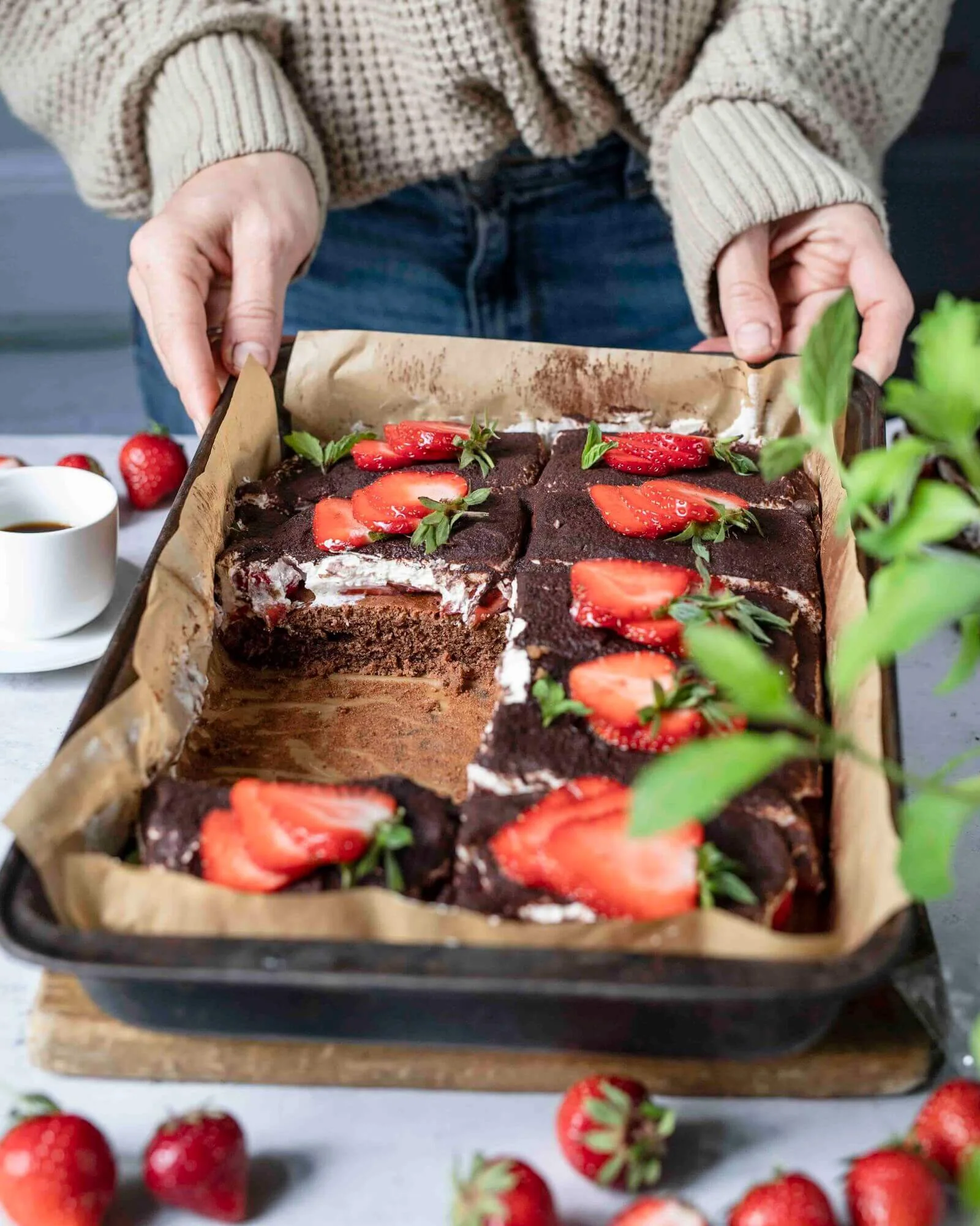 - Teig mit einer Gabel an mehreren Stellen einstechen. Espresso über den Teig laufen lassen. Erdbeeren auf dem Teig verteilen, gefolgt von der Sahnemischung. Jetzt mit Backkakao bestäuben und optional jede Schnitte mit einer halben Erdbeere belegen. Kaltstellen oder frisch servieren.