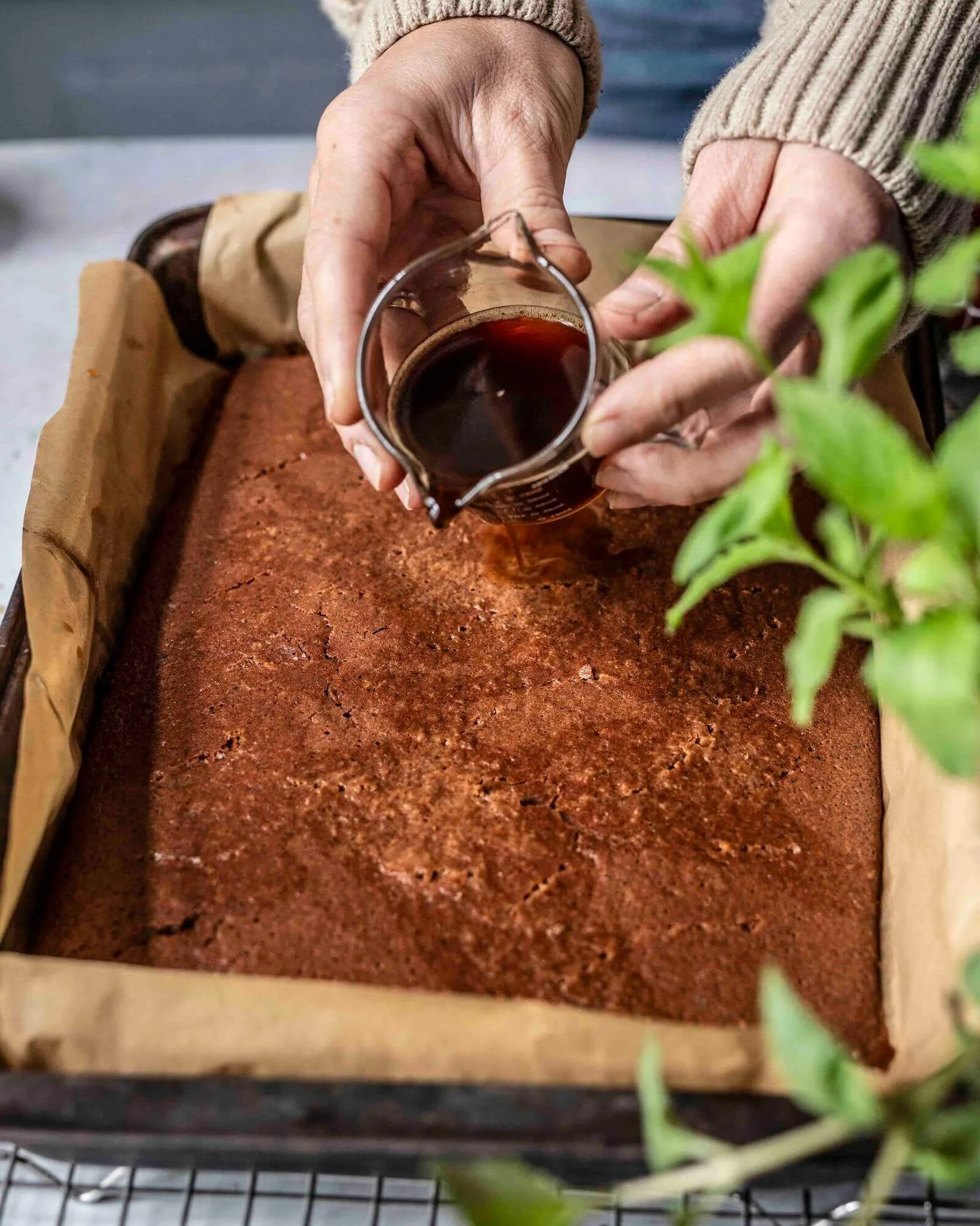 - Backform oder Blech mit Backpapier auslegen, so dass es am Rand etwas hochsteht. Teig auf das Blech geben. Bei 180°C Umluft 30 Minuten backen. (Stäbchenprobe). Vollständig auskühlen lassen.
