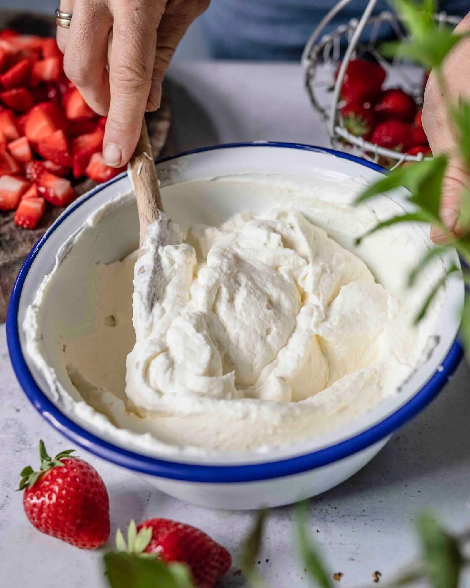 - Erdbeeren waschen, putzen, in kleine Würfel schneiden. Schlagsahne mit Puderzucker und Sahnesteif steif schlagen. Schmand unterheben.